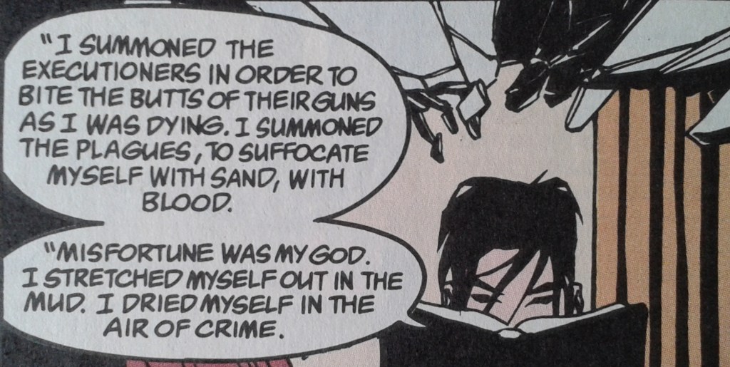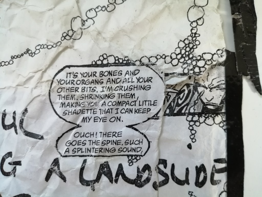 Even more so than books – when it came to lyric writing – magazine articles, newspaper reports, comics, television programmes and videos were constant sources of material for imaginative repurposing. Some of the images, phrases and ideas that would emerge in Edwards’s last lyrics would first surface in interviews given following his hospitalisation, as if using the opportunity to try and articulate their relevance to the thoughts that preoccupied him. A Latin quote, ‘Virescit vulnere virtus’ (strength is restored through wounding), that Edwards found in Tim Willocks’s prison novel Green River Rising and which he shared with Peter Paphides in a Time Out interview in December 1994, would be used in the original lyric for ‘Peeled Apples’, the opening track of Journal For Plague Lovers. In the same interview, Edwards elaborated on the subject of self-discipline and punishment of the body as a coping mechanism, saying: