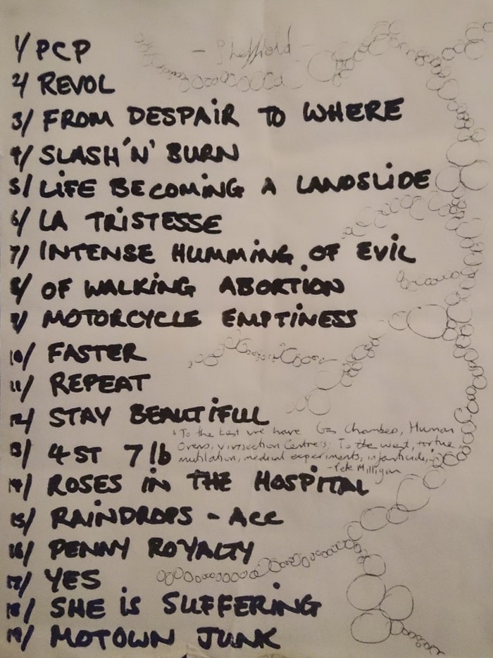 A series of quotes from The Promise of a New Day, a book of daily meditations for those undergoing the Twelve-step programme, featured on Edwards’s setlists towards the end of 1994. Excerpts from Hephzibah Menuhin, Andrea Dworkin, Ecclesiastes, Mao Tse-Tung, Henry Fielding, Epictetus and Simone Beauvoir were all lifted by Edwards from the book. But what in the original context are intended as prompts to reflection, hope and making positive changes, are isolated and left couched in a tone of negativity; focusing on nightmares, failings, disease, burdens and the inability to conceive infinity. They were interspersed with other setlist reminders of the prevailing destructiveness and absurdity of humankind, as expressed in the writing of RD Laing, Peter Milligan, JG Ballard and Eugène Ionesco.