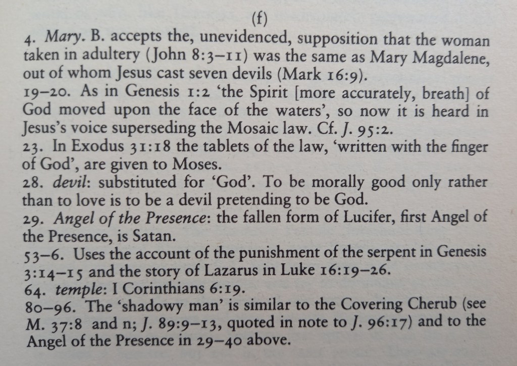 Original endnote to the William Blake poem ‘The Everlasting Gospel’ by editor Peter Butter which refers to the line ‘To be Good only is to be / A Devil, or else a Pharisee’ : ‘To be morally good only rather than to love is to be a devil pretending to be a god.’22