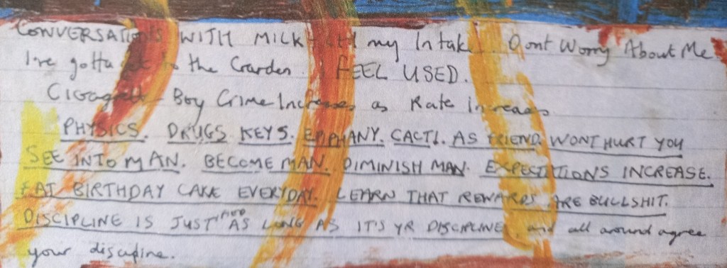 - ‘PHYSICS. DRUGS. KEYS. EPIPHANY. CACTI. AS FRIEND. WONT HURT YOU. SEE INTO MAN. BECOME MAN. DIMINISH MAN. EXPECTATIONS INCREASE. EAT BIRTHDAY CAKE EVERYDAY. LEARN THAT REWARDS ARE BULLSHIT. DISCIPLINE IS JUSTIFIED AS LONG AS IT’S YR DISCIPLINE, and all around agree your discipline.’